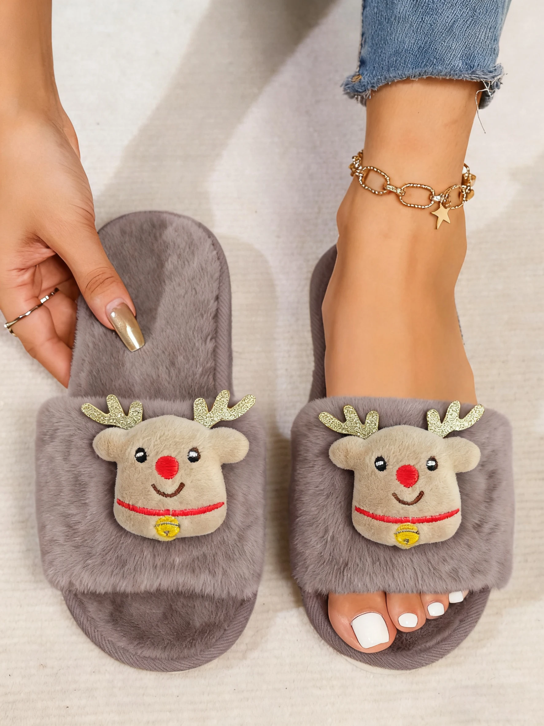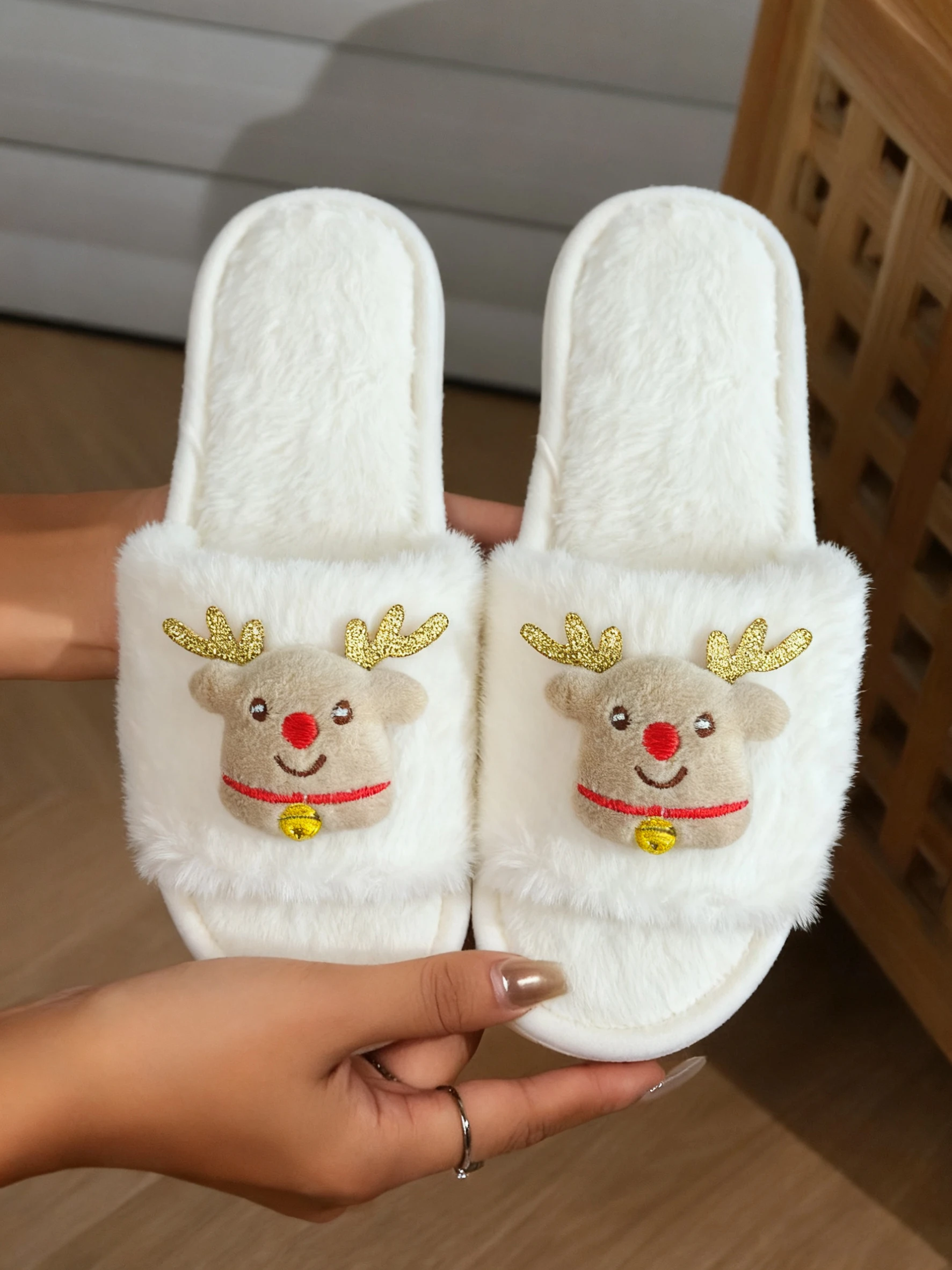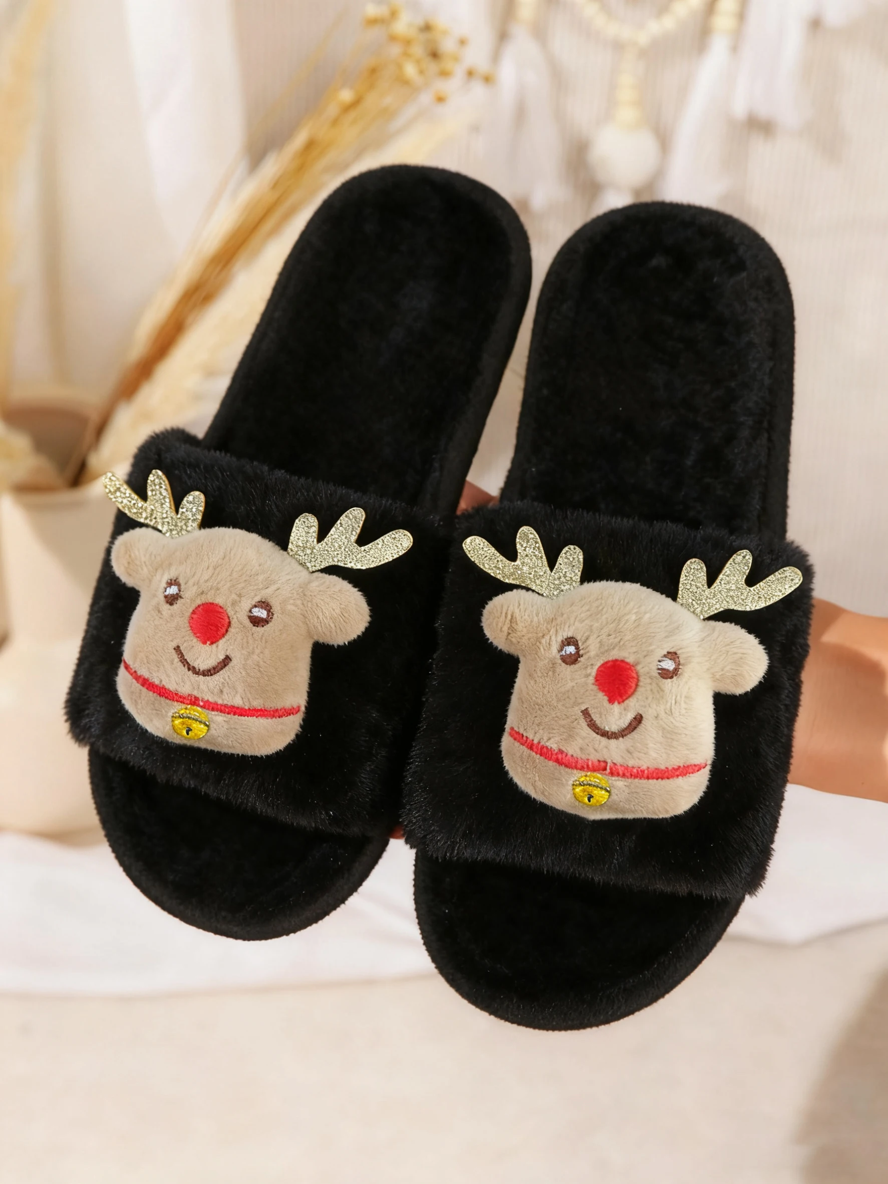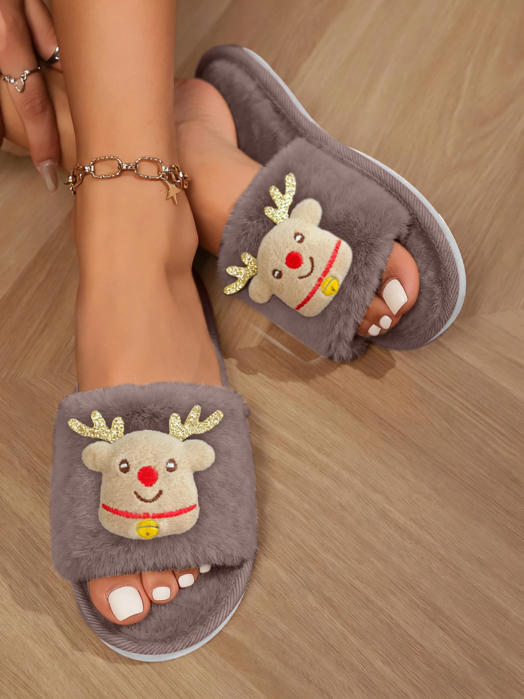 Ladies’ Home Slippers Autumn/Winter Christmas Cute Deer Pattern Plush Comfortable Open-Toed Indoor Slippers