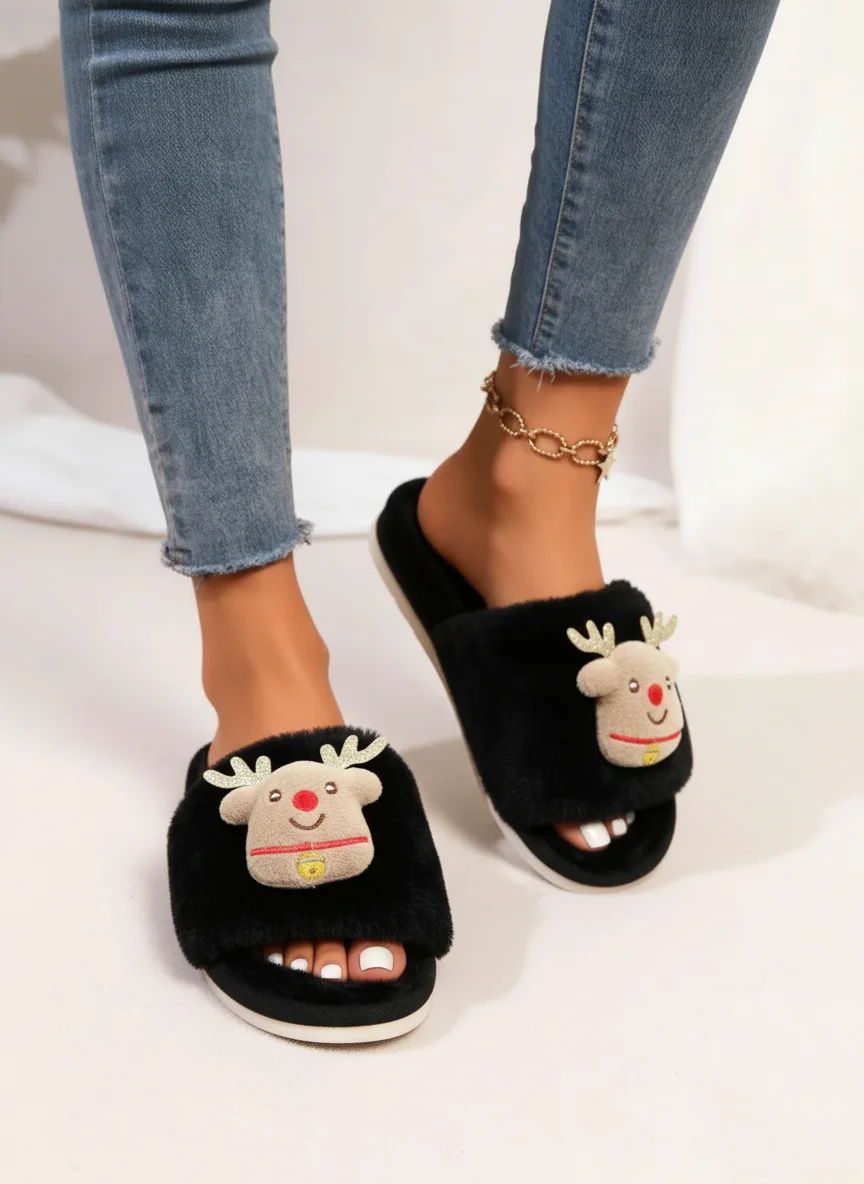Adorned with a charming deer pattern, these slippers add a festive touch to your winter wardrobe.